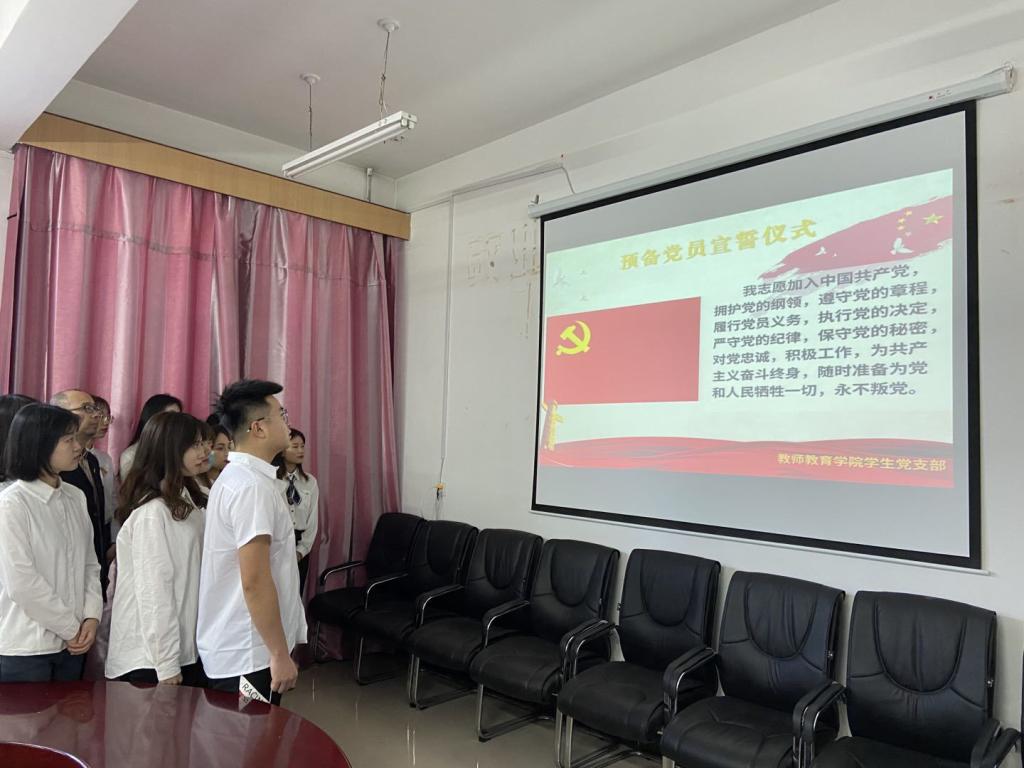 在系楼会议室,15名新党员和支部书记,辅导员等老党员及入党积极分子面对鲜艳的党旗庄严宣誓,立下承诺,愿为共产主义事业奋斗终生。