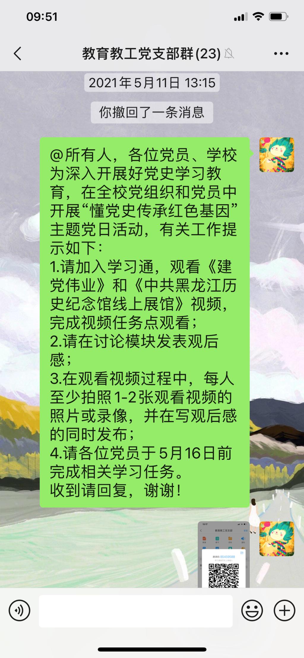 为深入开展好党史学习教育,引导广大党员把党的历史学习好、总结好,把中国共产党的红色基因传承好、发扬好,在推进公司高质量发展征程上续写新篇章。按照公司党史学习教育工作安排,教育教工党支部5月11日以学习通为载体组织党员线上学习的形式开展此次主题党日活动。