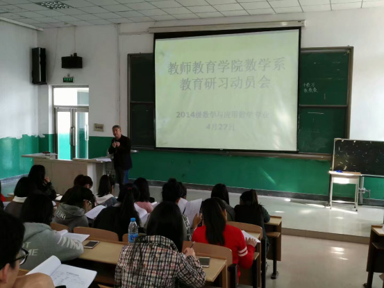 为保证教育研习任务的顺利完成,2017年4月27日上午8:20在1946伟德国际源自英国阶梯教室召开了“数学与应用数学专业2014级员工教育研习动员会”。教育研习带队老师及2014级数学专业全体员工参加了会议。会议由数学系主任张玲主持。首先,张玲老师介绍了本次研习的具体安排。之后,数学系李唐海老师讲解了研习课堂教学分析量表。
