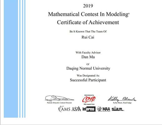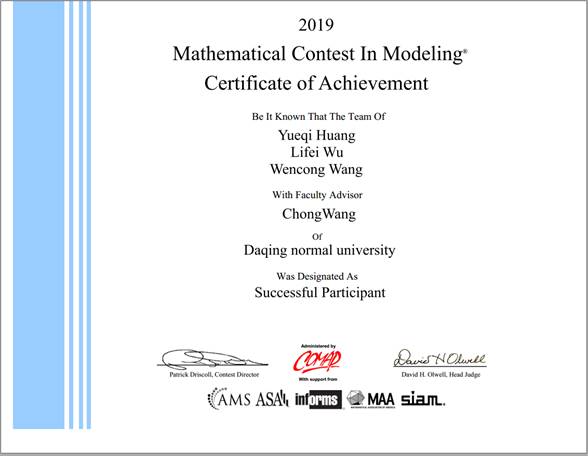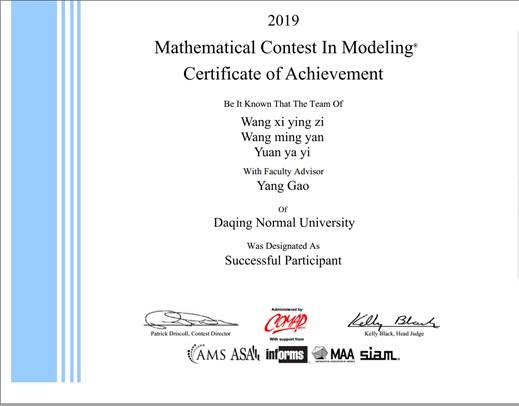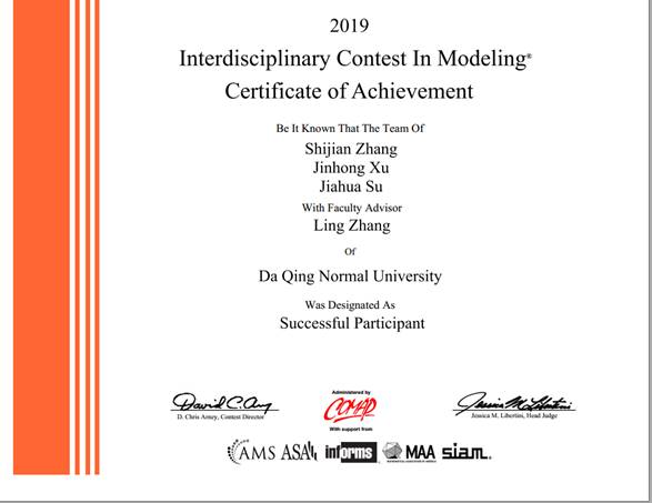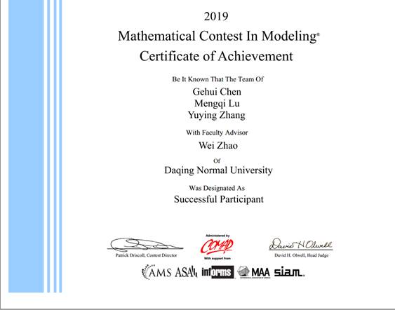 美国老员工数学建模竞赛(MCM)与交叉学科建模竞赛(ICM)是面向世界所有在校老员工和中员工的国际竞赛,赛题是以英文给出,每队至多三人,在四天时间完成一篇英文文章提交,公司员工自从2018年初次尝试该竞赛获得成功参赛后,2019年1月份,1946伟德国际源自英国99+1数学建模社团数学建模指导老师高扬、赵微、马丹、王冲和张玲老师在1月25日到1月29日四天时间里员工完成了比赛的所有环节,形成了英文论文20页,刚获悉公司5组员工全部获得了美国老员工数学建模竞赛成功参赛奖。该竞赛奖项分为Disqualified(不合格)、Unsuccessful(不成功参赛)、Successful Participant(成功参赛)、Honorable Mention(优秀奖)、Meritorious(优异奖)、Finalist(优胜提名奖)、Outstanding Winner(优胜奖)。公司员工获得Successful Participant,意味着这个队的论文回答了竞赛题要求的所有问题,并且给出了结果。这次公司员工参与竞赛虽然是对国际赛事的尝试,但从中公司员工在应用数学知识、数学软件解决实际问题的能力以及员工应用英语表达的能力,这项成果必将推动公司数学建模竞赛获得更好成绩。