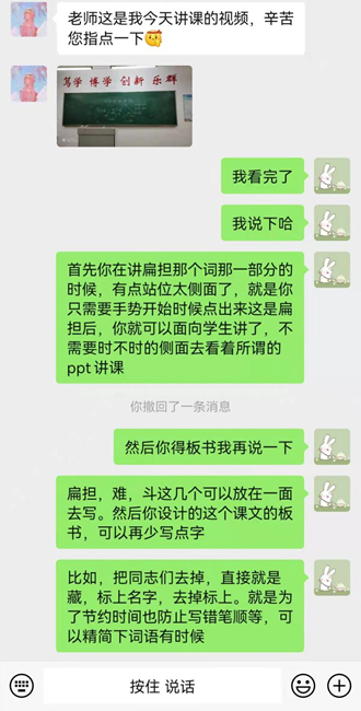 本次训练,首先由各组指导老师通过钉钉会议从总体情况帮助同学总结经验,分析不足,强化了新课标理念的侧重,强调面试时需要关注的问题。之后,由老师逐一听课、评课,从结构化面试到试讲,从板书设计到教学内容分析,进行了细致有针对性地指导训练。