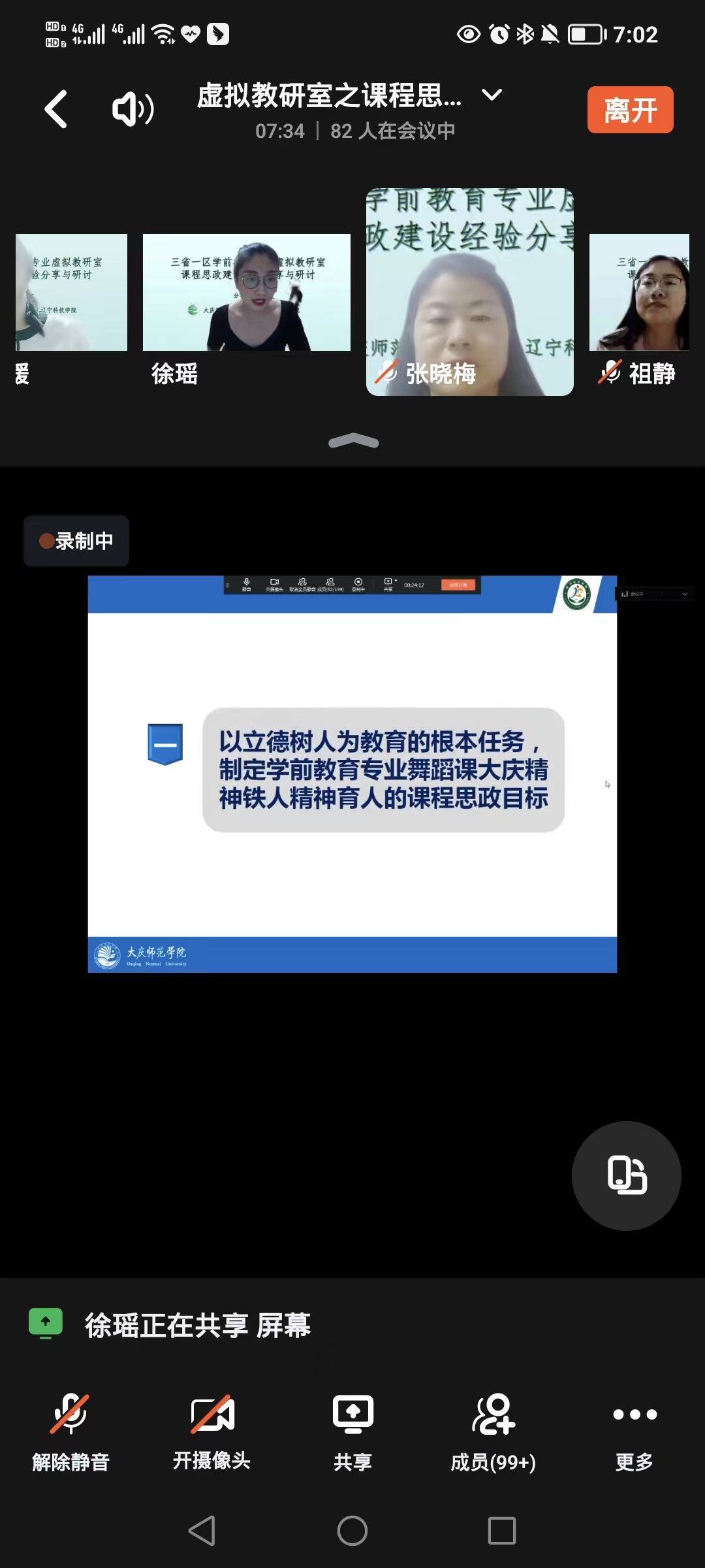 徐瑶老师以舞蹈课程为例,代表学前教育专业做了题为“学前教育专业艺术类课程融入大庆精神铁人精神课程思政”的经验分享,从课程思政的目标、内容、途径、方法、评价等方面,详细介绍了大庆精神铁人精神融入艺术类课程的实践经验。