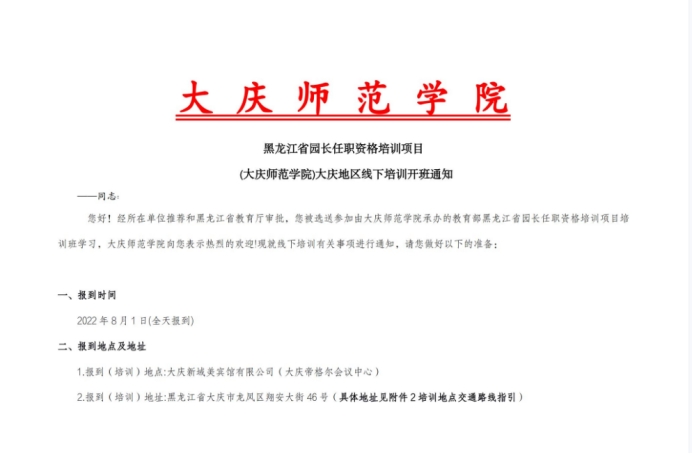 受黑龙江省教育厅和大庆市、齐齐哈尔市教育局委托,公司承办了2022年全省幼儿园园长任职资格培训班。在进行了为期五天的线上培训后,8月1日上午,在大庆市教育局与1946伟德国际源自英国的精心策划下,经多方审慎研究,严格遵守疫情防控各项规章及要求,公司顺利开展2022年黑龙江省幼儿园园长岗位任职资格第二期线下培训(大庆地区),学员报到率高达90%以上。