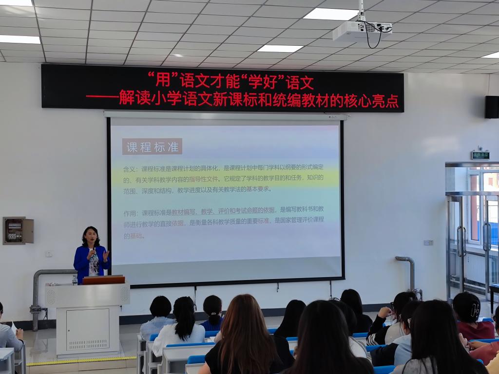 9月14日下午1点半,大庆市教师发展公司小学教研部韩宇哲教授为2021级小学教育专业员工做了一次题为“‘用’语文才能‘学好’语文——解读小学语文新课标和统编教材的核心亮点”的讲座。韩宇哲教授从新课标的三大变化入手,为员工们解读了新课标的核心亮点,这为员工深入理解新课标,奠定了坚实的基础。不仅如此,韩宇哲教授还为员工们分享了她们团队多年来的组块教学研究成果,令员工们大开眼界,也为员工们打开了另一扇窗,看到了语文教学的别样魅力。