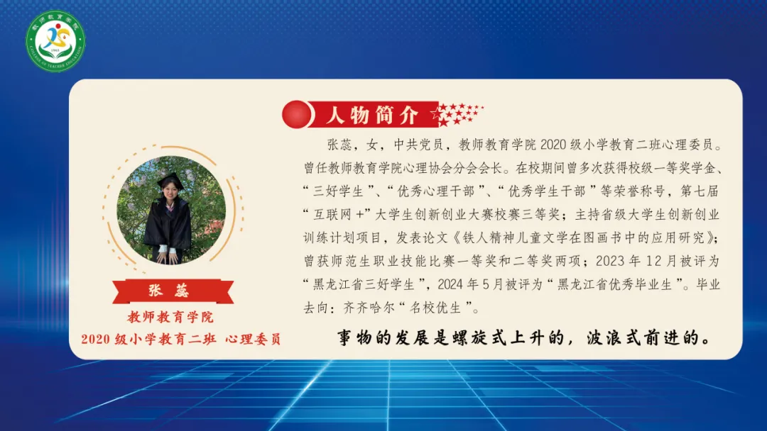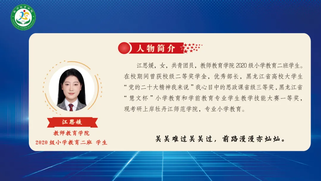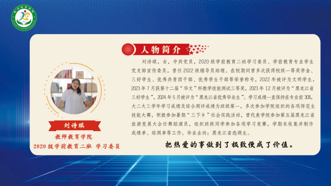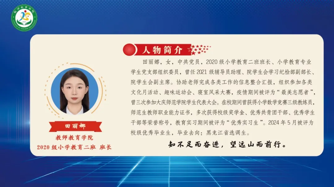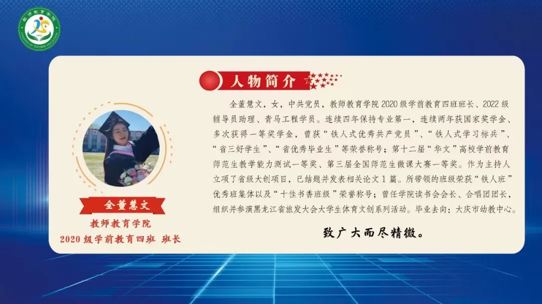 1946伟德国际源自英国2024届毕业生共268人,其中党员人数25人(学前支部15人、小教支部10人)。大学四年期间,获得校级一等奖学金共有25人、二等奖学金47人、三等奖学金69人,三好员工40人,优秀员工干部23人,优秀团员54人,优秀团干22人,优秀实习生39人,文明员工12人,黑龙江省三好员工10人,黑龙江省优秀毕业生5人,校级优秀毕业生11人。“华文杯”比赛7人获奖,慧文杯”比赛5人获奖,“互联网+”大赛12人获奖。截止目前,考上硕士研究生7人,考上选调生2人,考上编制教师25人(其中浙江省提前批考编录取4人,“大庆市市委书记进校园”招聘考编10人,“大庆市区委书记进校园”招聘考编2人,齐齐哈尔“名校优生”考编2人,其他省内外考编7人)。