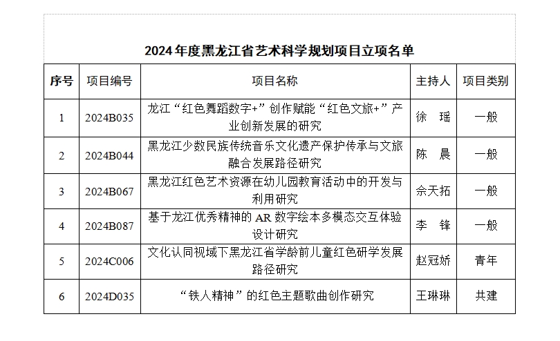近日,黑龙江省文化和旅游厅公布了2024年黑龙江省艺术科学规划项目立项结果,公司教师在此次项目立项中获批一般项目4项,青年项目1项,共建项目1项。此次省级科研项目的获批促进了公司整体科研水平的提升,为公司科研工作的整体发展夯实了基础。