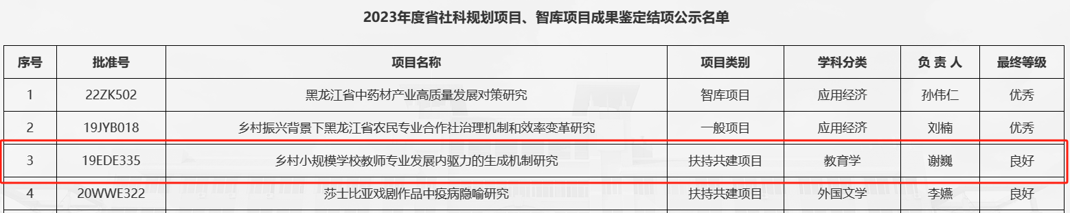 近日,黑龙江省社科工作办发布了2023年度省社科规划项目、智库项目的鉴定结项名单。公司谢巍老师主持的《乡村小规模公司教师专业发展内驱力的生成机制研究》顺利通过结题验收,并鉴定为“良好”等级。
