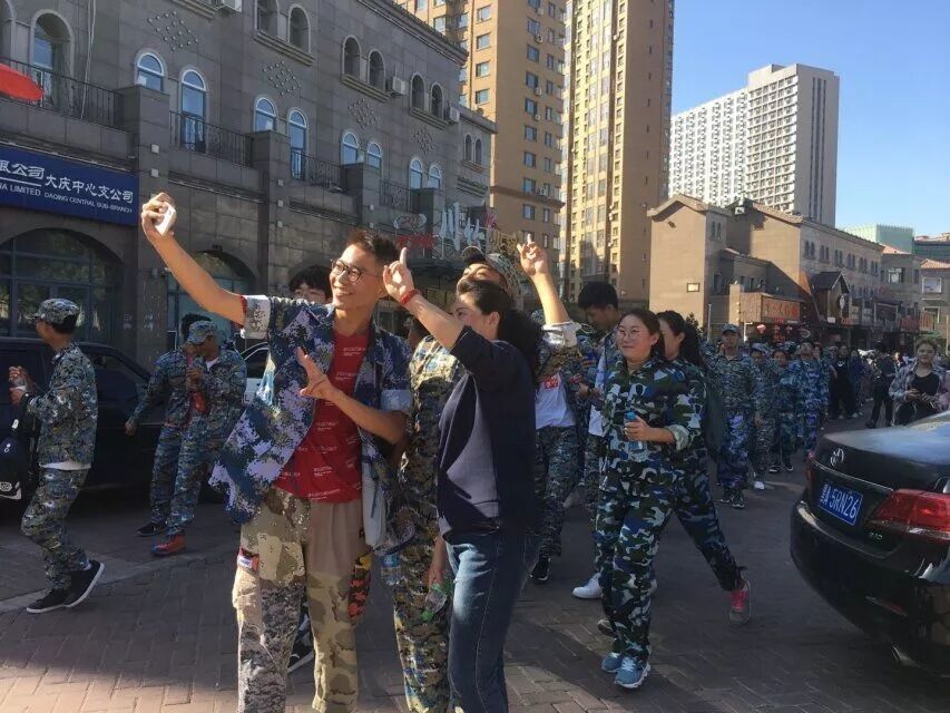 从安静的校园到车水马龙的大街,从平坦的校园大道到高楼林立的公路街区,迷彩军队整齐统一,像是一只真正的军队一样坚定地前进着。走累了,互相搀扶坚持住,走急了,回头等等伸把手,友谊在一个微笑,一瓶矿泉水,一双相挽的双手间传递。