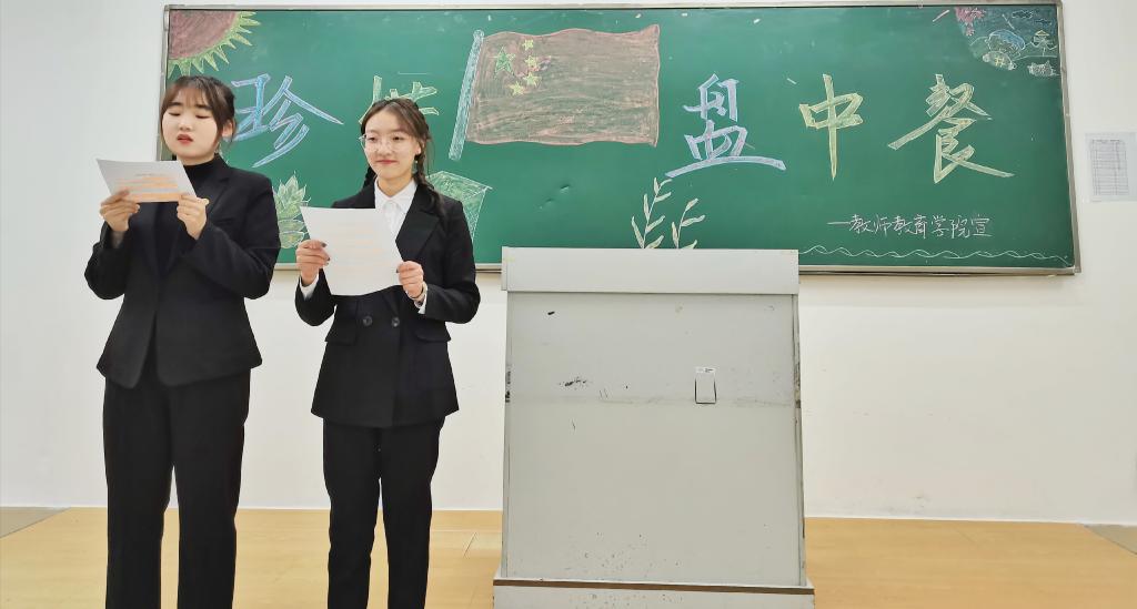 其中赵泽阳同学现场挥毫,凭借一手好字为活动提词,以文字的形式代表全体同学写下惜粮宣言,表达了青年学子对浪费行为的坚决抵制以及对珍惜粮食行动的呼吁。此外同学们还表演了以光盘行动为主题的小品,再现了网络吃播背后的严重浪费现象,通过反讽的表演形式向同学们大声宣告浪费行为之可耻。