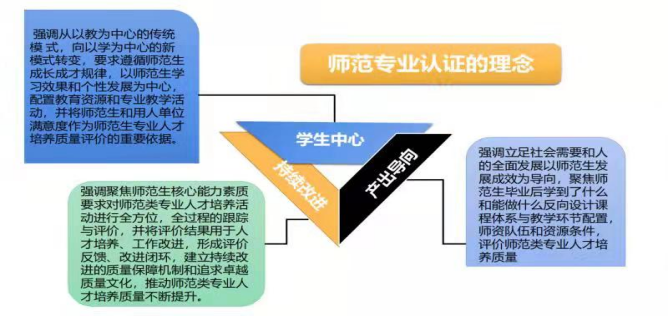 师范类专业认证理念为“员工中心,产出导向,持续改进”,这 是师范类专业认证工作的行动指针,贯穿师范类专业认证全过程。