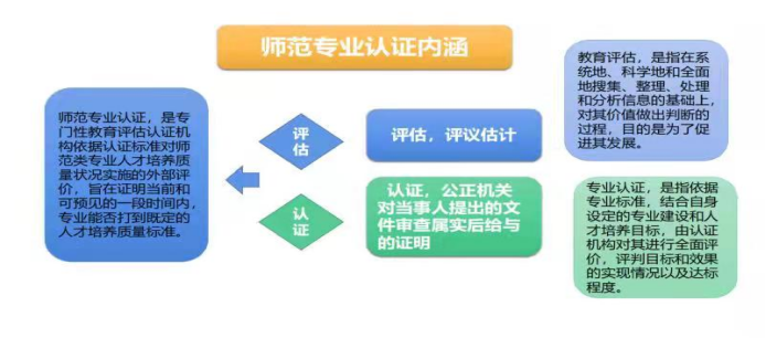 师范类专业认证是专门性教育评估认证机构依照认证标准对师范类专业人才培养质量状况实施的一种外部评价过程,旨在证明当前和可预见的一段时间内,专业能否达到既定的人才培养质量标准。