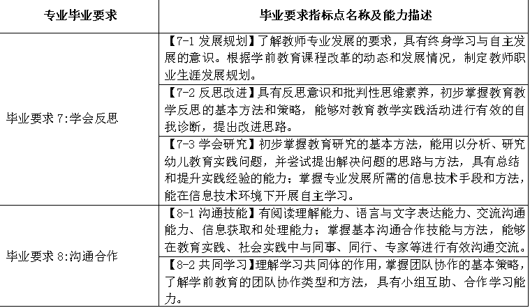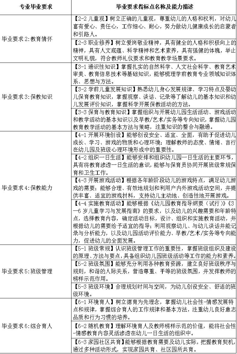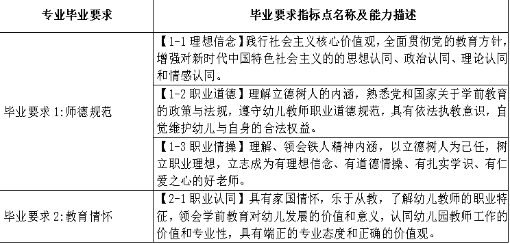 专业应根据幼儿园教师专业标准,制定明确、公开的毕业要求。毕业要求能够支撑培养目标,并在师范生培养全过程中分解落实。专业应通过评价证明毕业要求的达成。专业制定的毕业要求应涵盖以下内容: |