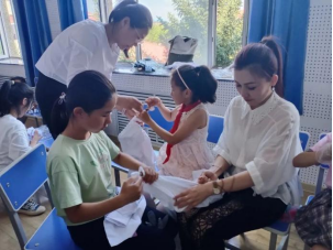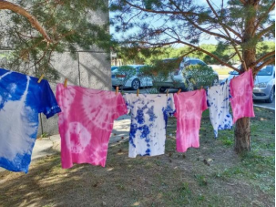 到了最期待的DIY环节,同学们早已按耐不住心中的激动,拿起手旁的衣服和背包,发挥各自的奇思妙想,借助皮筋、棉线、夹子等工具扎出一个个姿态各异的作品。
