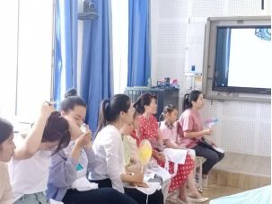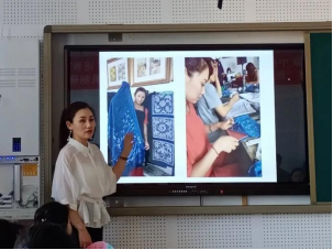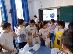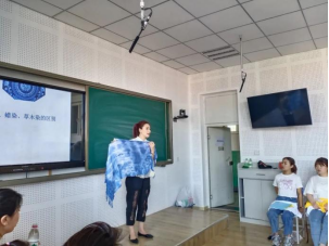 活动开始前,李明老师在教室给大家讲解了扎染的来源与发展,并详细地向大家讲解了扎染制作的要领、技艺及各种有趣的捆扎方式。