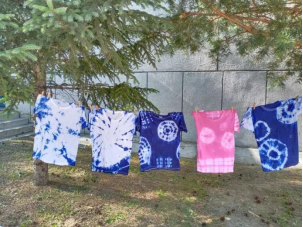 进入“染”的环节,李明老师带领同学来到室外一起将扎好的衣服和背包煮染、拆线、晾干。同学们站在染锅旁,静静地等待着一件属于自己“独一无二”的扎染T恤。
