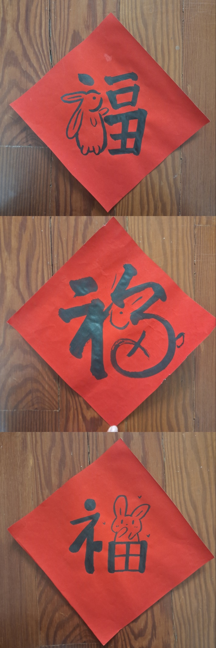 一个简单的“福”字,蕴含着丰富的民族文化;每一“福”字,都是一个美好的愿望;每一个“福”字,都是对未来的憧憬;每一个“福”字,都是对新一年的祝福。让我们接过红彤彤的“福”字,感受着十足的“年”味和“福”气。 岁序常易,华章日新。欢声笑语,总结一年成果。辞旧迎新,来年更多精彩。不负韶华 只争朝夕,2023大展宏“兔”!