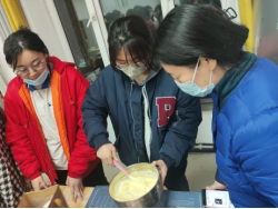 师生分工合作,有的按比例称重牛奶与面粉,有的将蛋清与蛋黄分离,有的搅拌食材。各种各样的食材,在大家手里不断变化形状,每个人都忙得不亦乐乎。