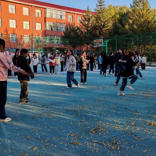 伴随着裁判员的一声令下,比赛开始。队员们默契配合,数着个数、踩着节奏,以饱满的精神风貌投入到跳大绳比赛中。