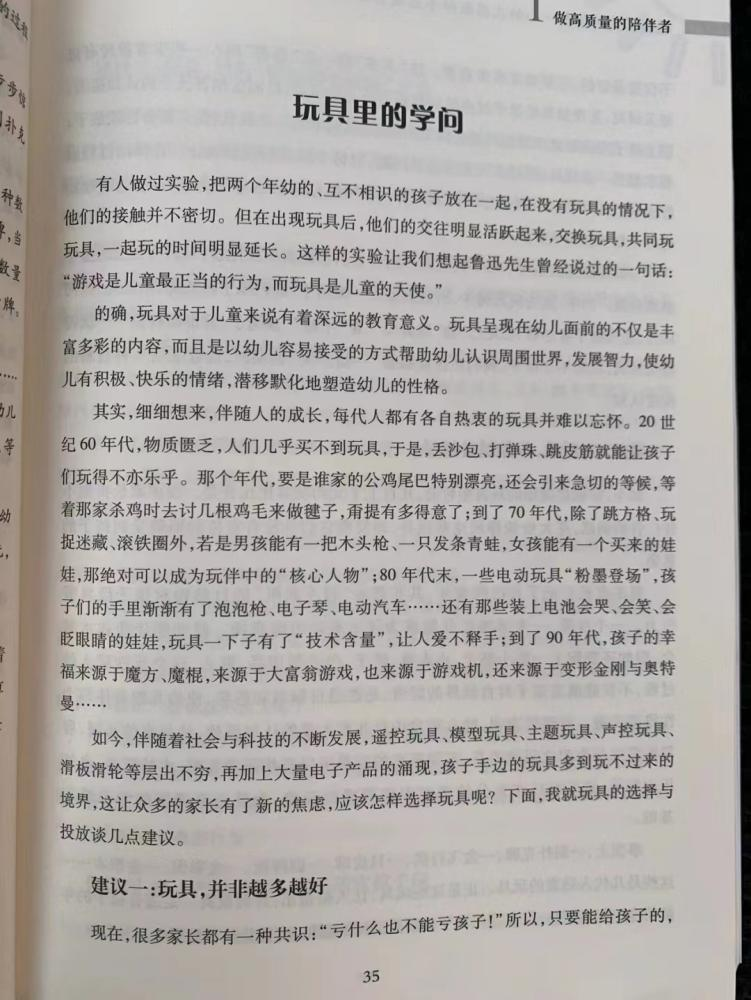 有人曾做过试验,两个孩子在有玩具的情况下,交往会更活跃,一起玩的时间也明显增长。鲁迅先生说过:“游戏是儿童最正当的行为,而玩具是儿童的天使。”好的玩具不仅能给幼儿带来快乐,还能够为幼儿提供丰富的感知觉刺激和社会化历史经验,帮助幼儿认识和掌握玩具所模拟的社会生活用品的用途和使用方法,发展幼儿的思维、想象能力和创造性。