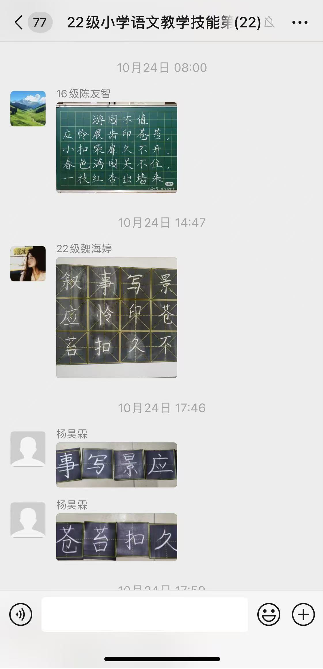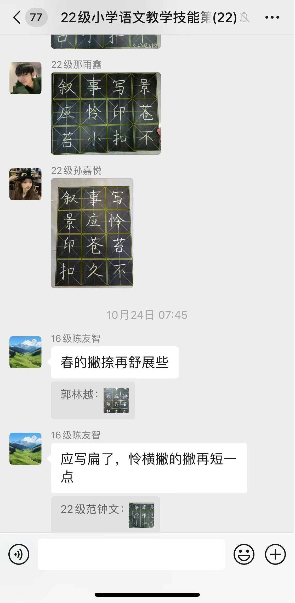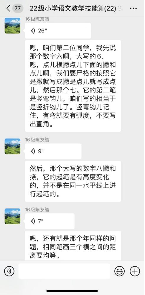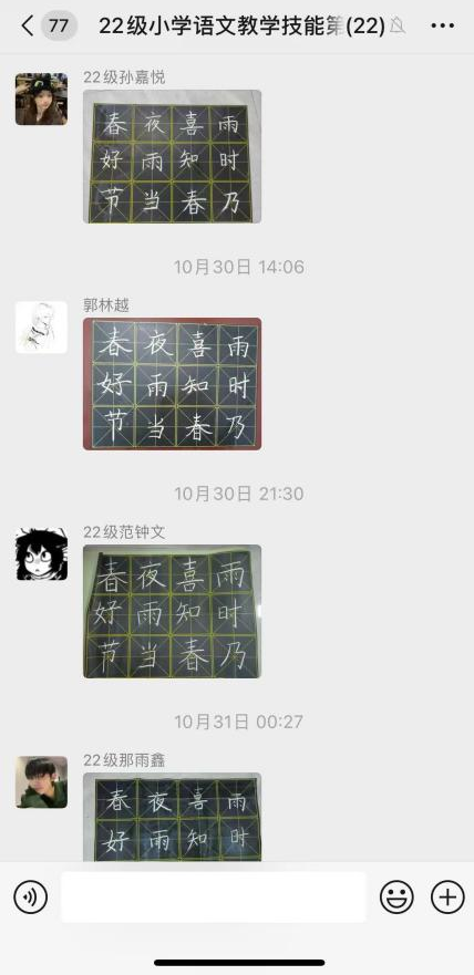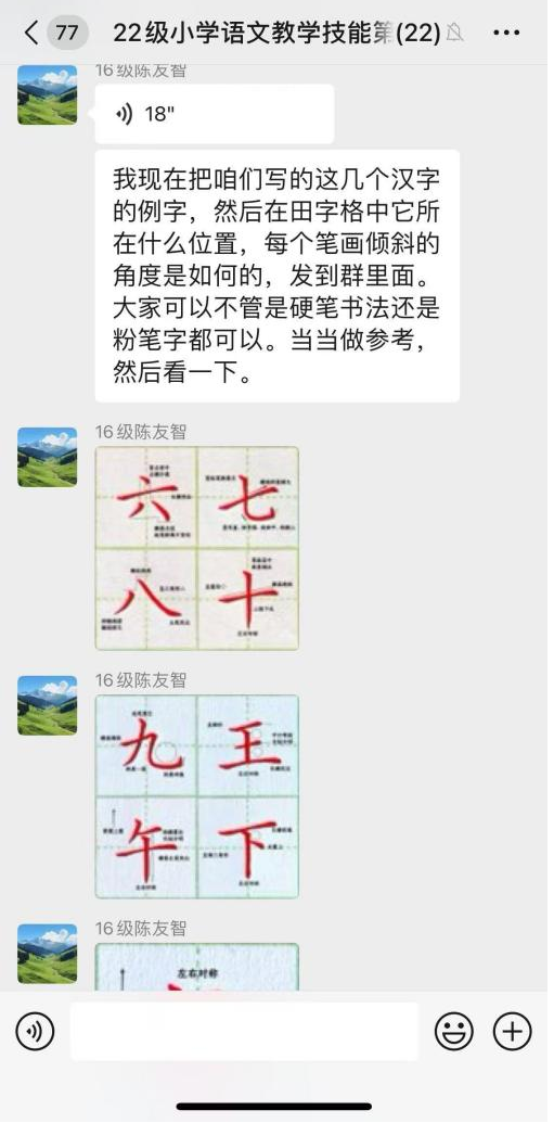 此外,技能训练小组建立专门的微信群,邀请陈友智老师进群指导。每天陈老师布置当天训练内容,同学们上传书写的粉笔字图片,陈老师对每个人的具体书写情况进行点评和指导。这种即时的交流方式,让同学们能够随时学习、随时提问,极大地提高了学习效率和兴趣。
